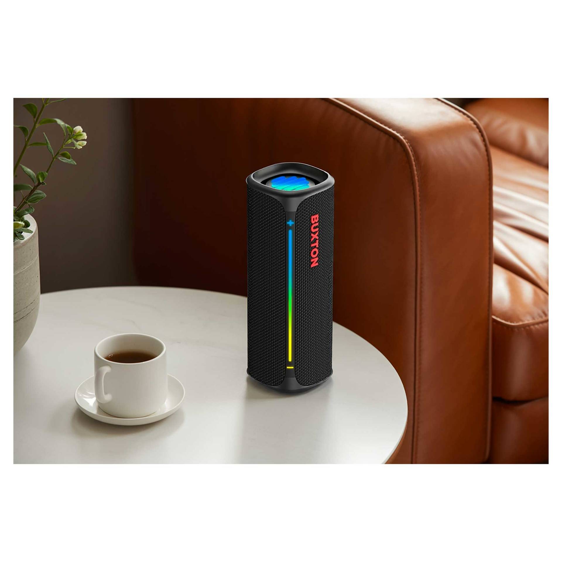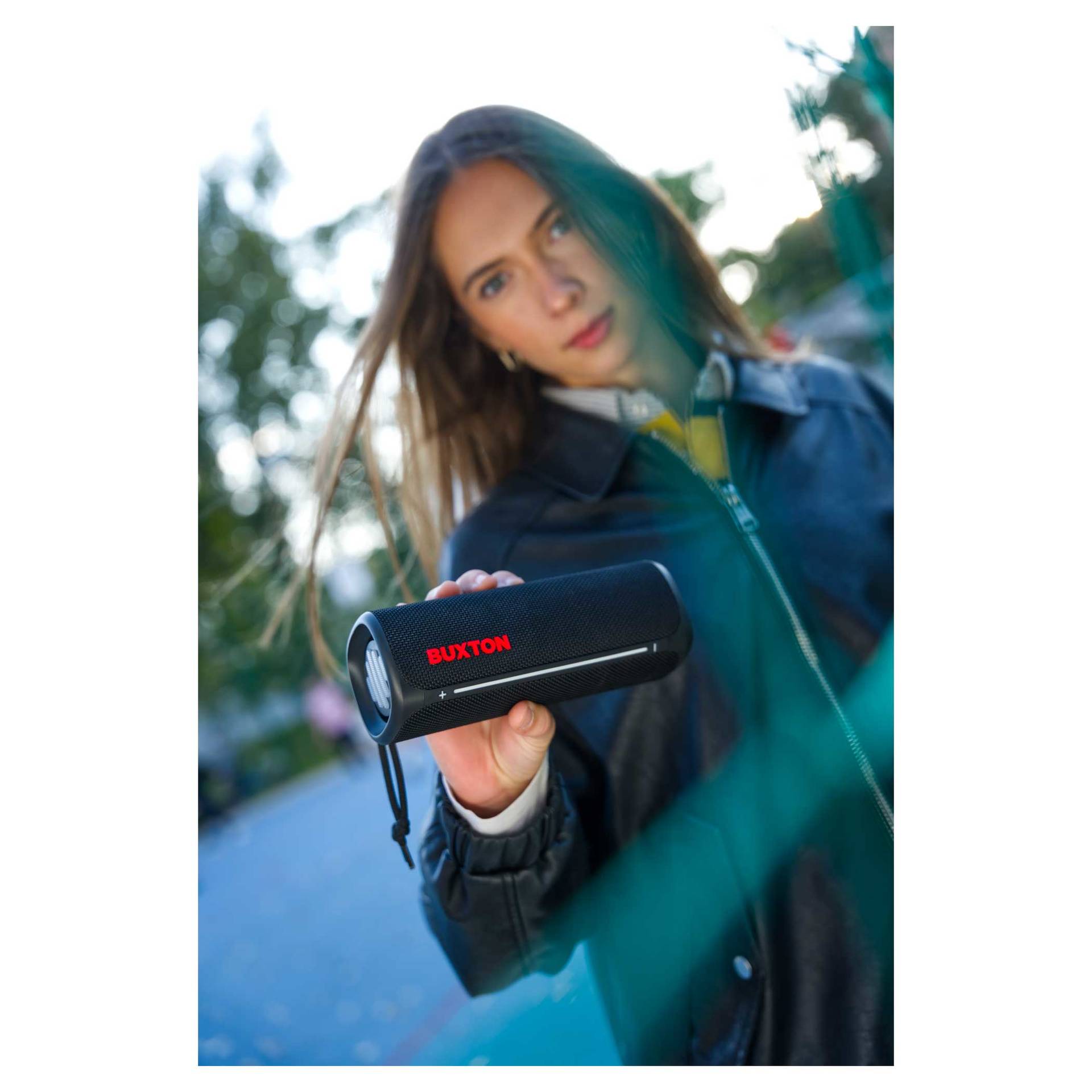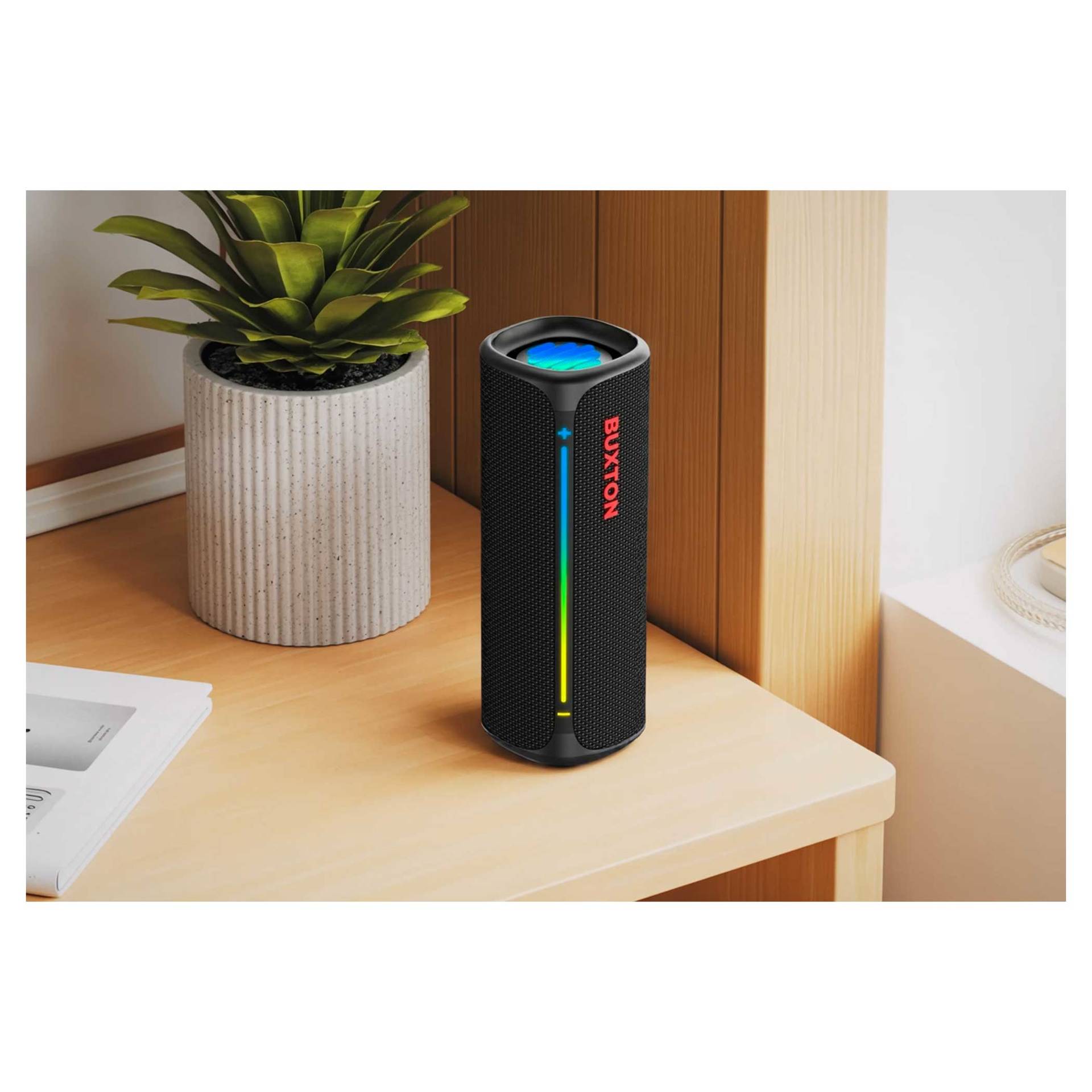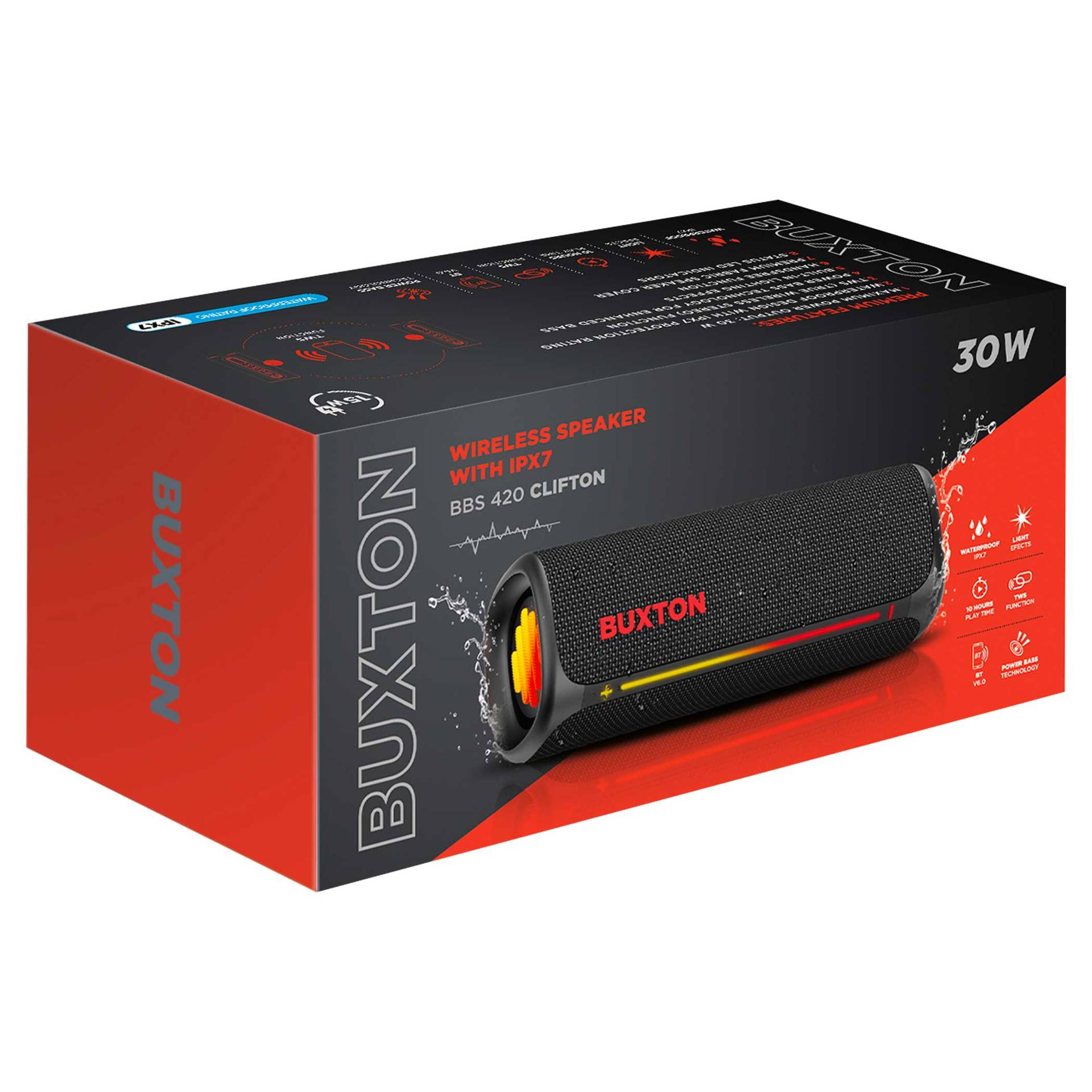 Głośnik bezprzewodowy Buxton BBS 420 CLIFTON łączy w sobie wyrafinowane wzornictwo, trwałość i potężny dźwięk w jednym kompaktowym urządzeniu. Dźwięk o mocy 30 W z technologią Power Bass zapewnia doskonałe wrażenia słuchowe na imprezach, spotkaniach rodzinnych lub podczas relaksu z ulubionymi audiobookami. Certyfikat wodoodporności i odporności na wilgoć IPX7 sprawia, że nie musisz obawiać się zabrania głośnika na zewnątrz – krople wody lub wilgoć nie zaszkodzą mu. Stylowa tekstylna osłona wygląda elegancko, a efekty świetlne podkreślą wieczorną atmosferę. Łatwą, intuicyjną obsługę uzupełniają wskaźniki LED. Wbudowany mikrofon umożliwia odbieranie połączeń bez konieczności sięgania po telefon.