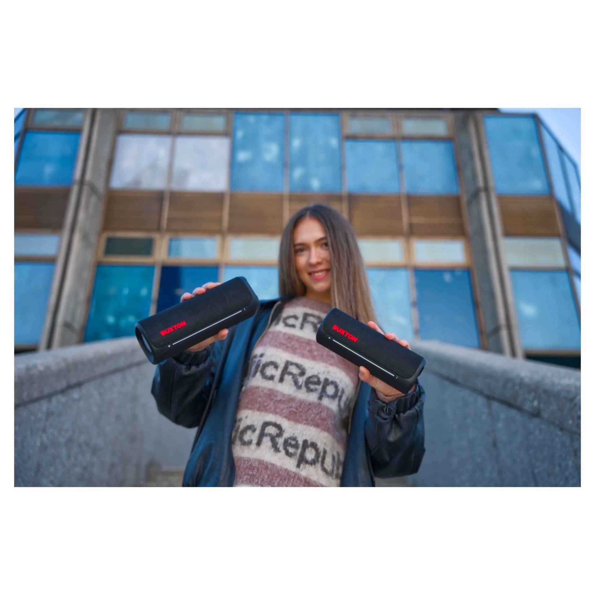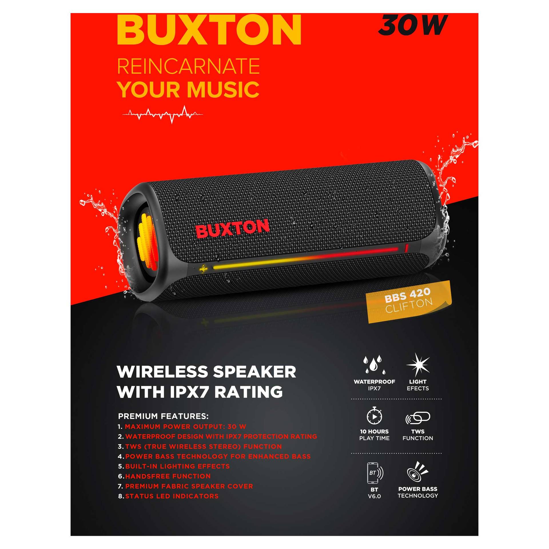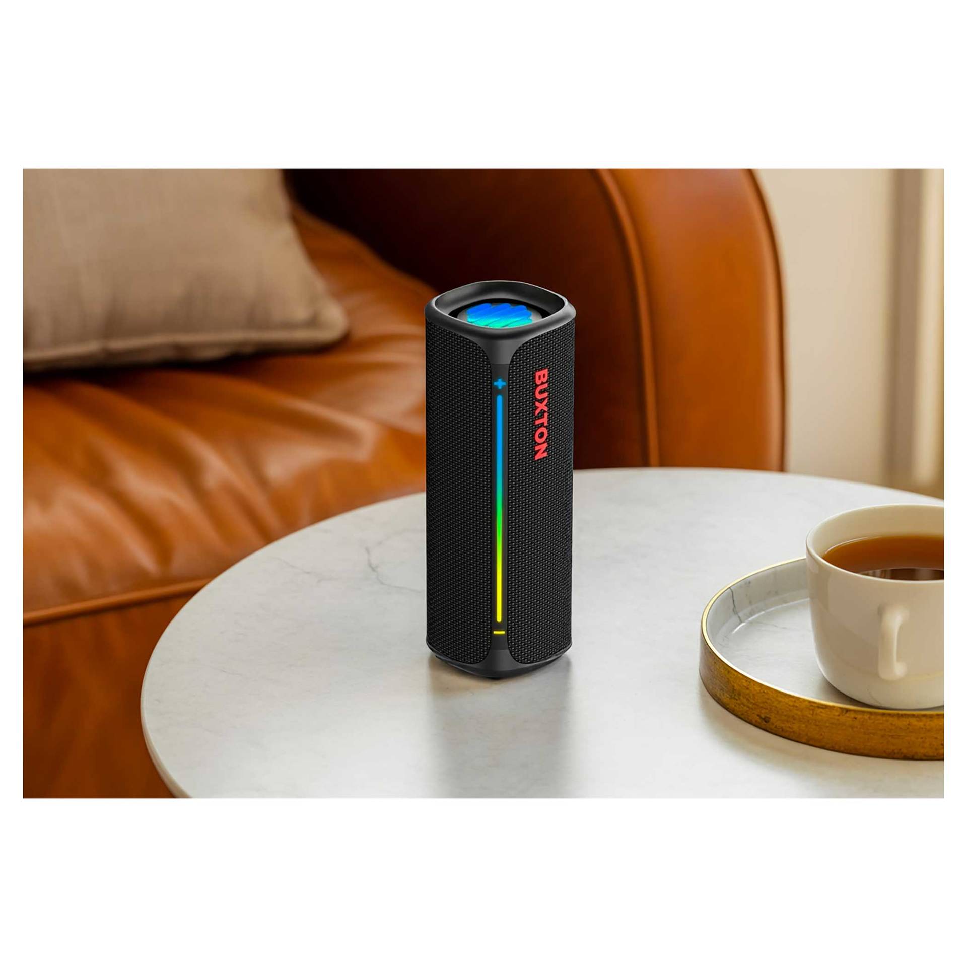 Głośnik bezprzewodowy Buxton BBS 420 CLIFTON łączy w sobie wyrafinowane wzornictwo, trwałość i potężny dźwięk w jednym kompaktowym urządzeniu. Dźwięk o mocy 30 W z technologią Power Bass zapewnia doskonałe wrażenia słuchowe na imprezach, spotkaniach rodzinnych lub podczas relaksu z ulubionymi audiobookami. Certyfikat wodoodporności i odporności na wilgoć IPX7 sprawia, że nie musisz obawiać się zabrania głośnika na zewnątrz – krople wody lub wilgoć nie zaszkodzą mu. Stylowa tekstylna osłona wygląda elegancko, a efekty świetlne podkreślą wieczorną atmosferę. Łatwą, intuicyjną obsługę uzupełniają wskaźniki LED. Wbudowany mikrofon umożliwia odbieranie połączeń bez konieczności sięgania po telefon.