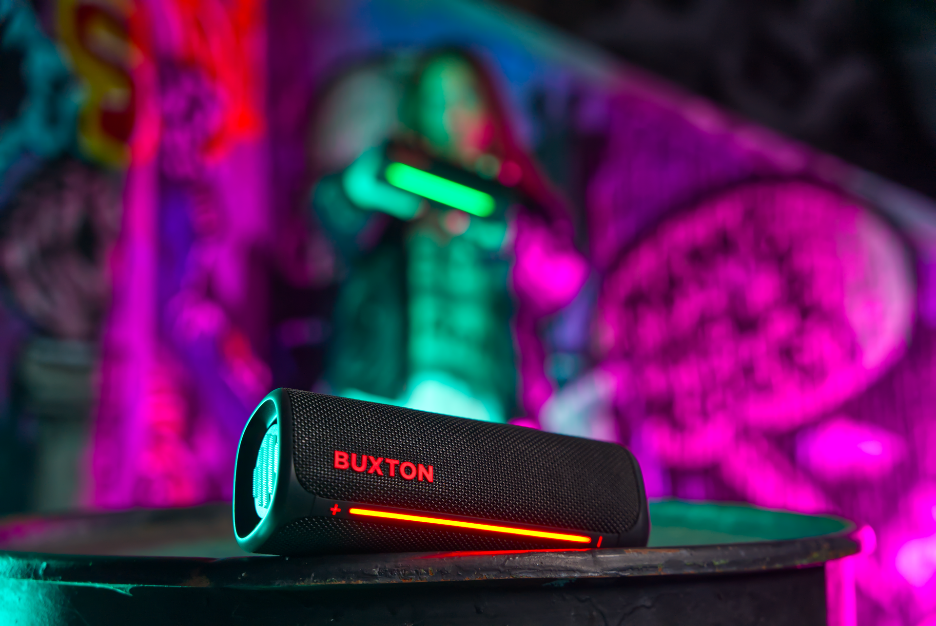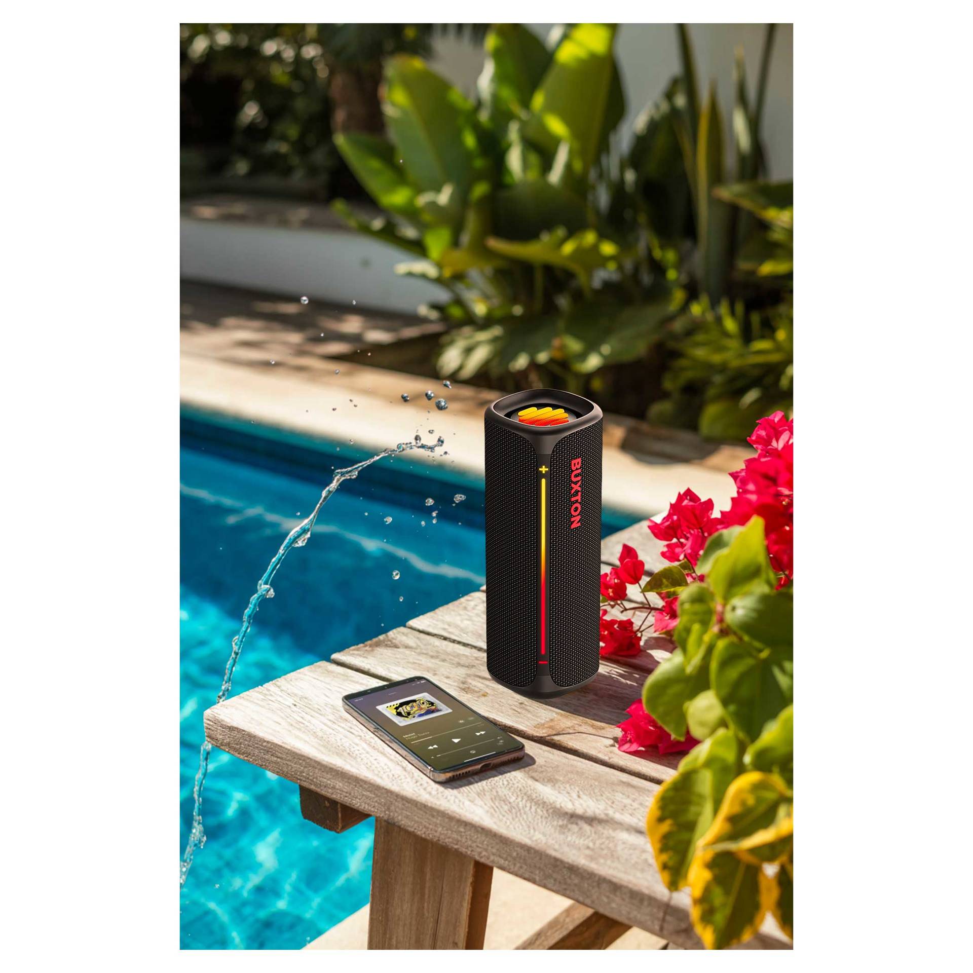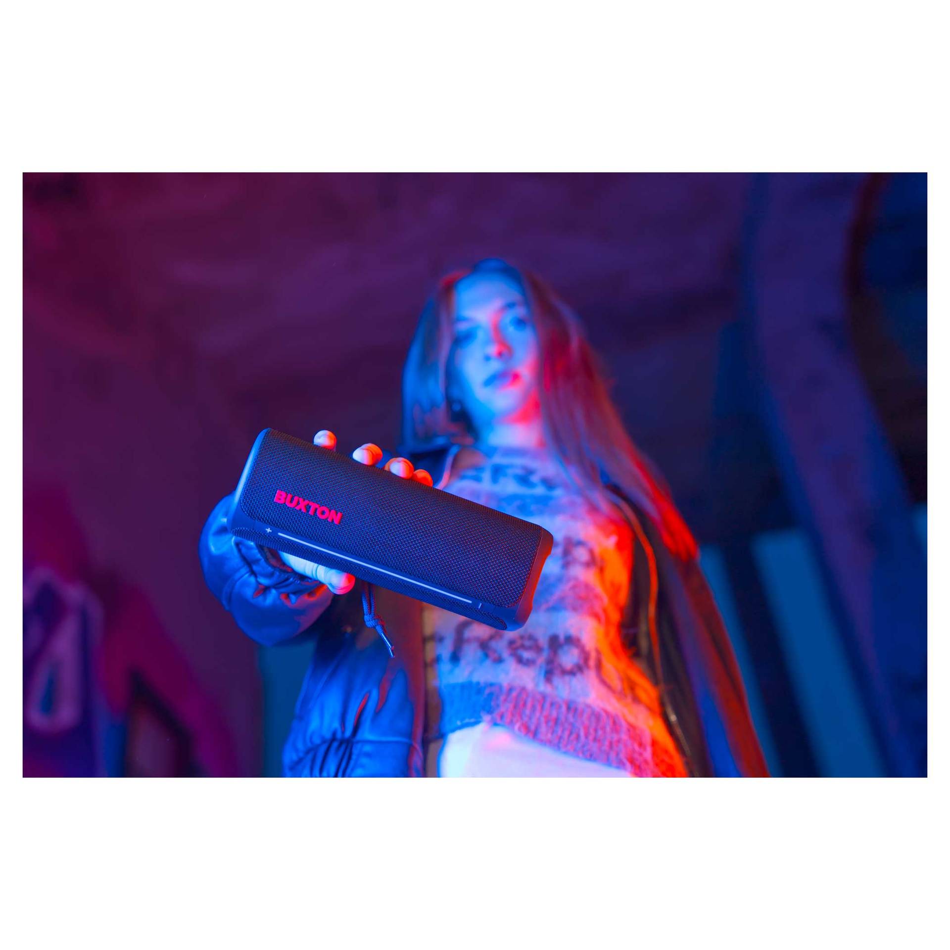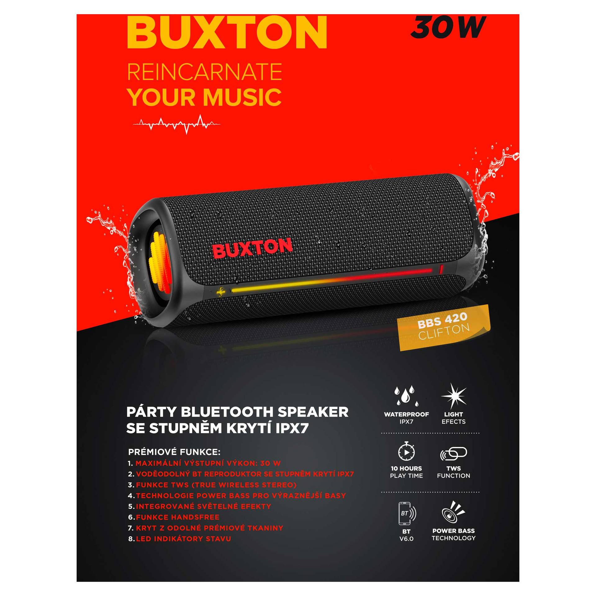 Głośnik bezprzewodowy Buxton BBS 420 CLIFTON łączy w sobie wyrafinowane wzornictwo, trwałość i potężny dźwięk w jednym kompaktowym urządzeniu. Dźwięk o mocy 30 W z technologią Power Bass zapewnia doskonałe wrażenia słuchowe na imprezach, spotkaniach rodzinnych lub podczas relaksu z ulubionymi audiobookami. Certyfikat wodoodporności i odporności na wilgoć IPX7 sprawia, że nie musisz obawiać się zabrania głośnika na zewnątrz – krople wody lub wilgoć nie zaszkodzą mu. Stylowa tekstylna osłona wygląda elegancko, a efekty świetlne podkreślą wieczorną atmosferę. Łatwą, intuicyjną obsługę uzupełniają wskaźniki LED. Wbudowany mikrofon umożliwia odbieranie połączeń bez konieczności sięgania po telefon.