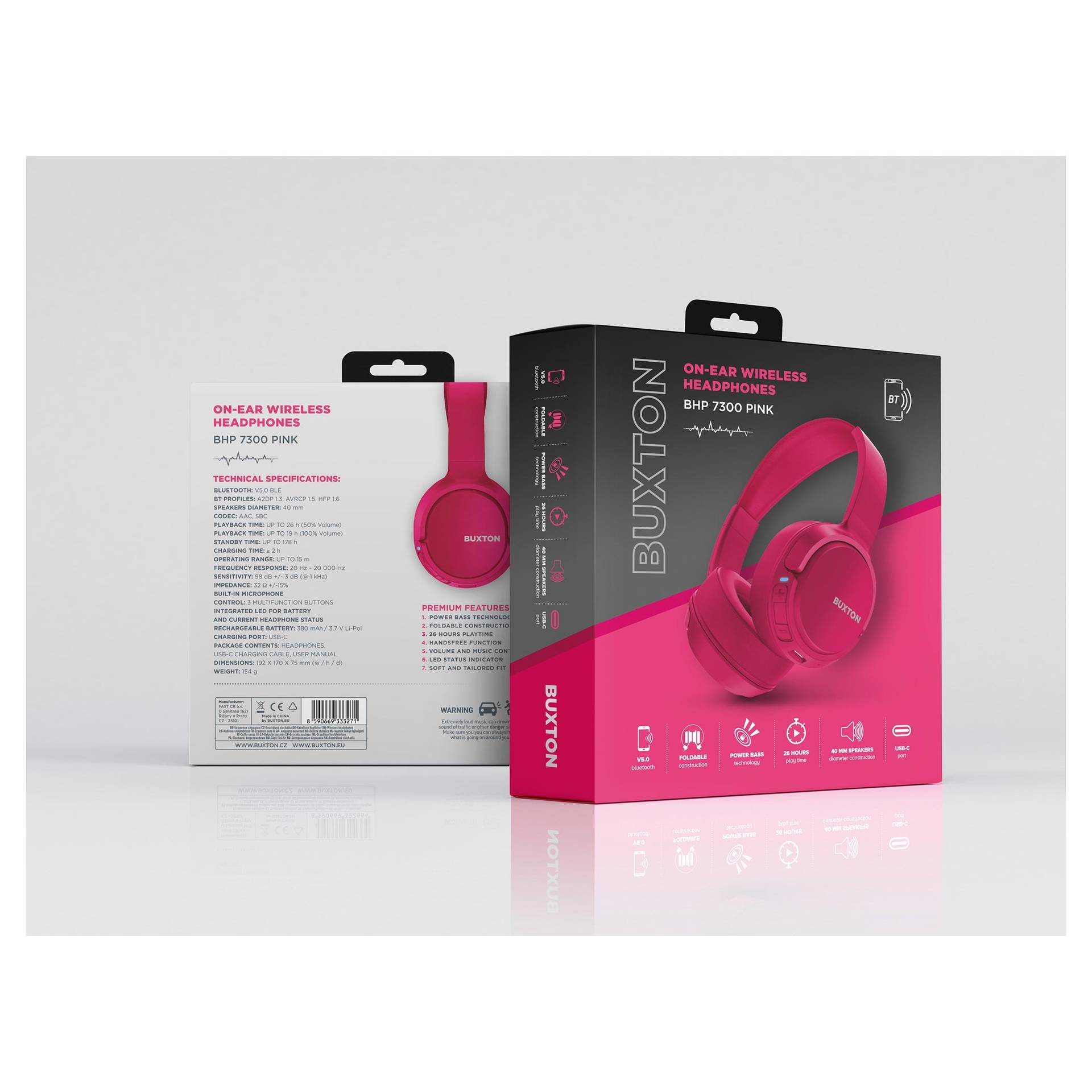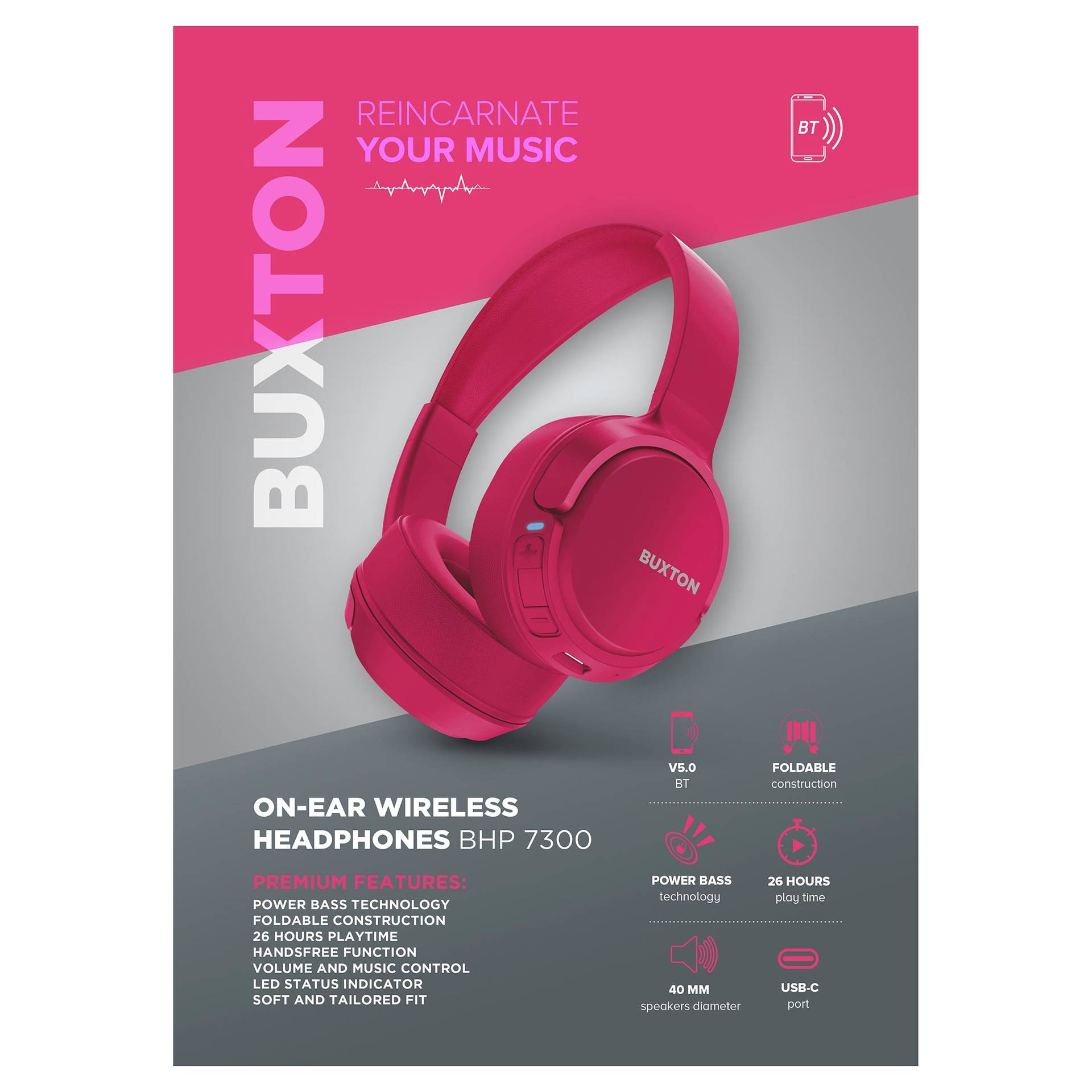 Słuchawki Buxton BHP 7300 łatwo łączą się przez Bluetooth V5.3 BLE w zasięgu piętnastu metrów od źródła dźwięku. Wygodna jest regulacja głośności bezpośrednio na słuchawkach, zintegrowany mikrofon, trzy wielofunkcyjne przyciski sterujące, funkcja zestawu głośnomówiącego oraz dioda LED, która w każdej chwili informuje o poziomie naładowania baterii i aktualnym stanie słuchawek. Słuchawki, które ładują się przez port USB-C w mniej niż dwie godziny, mogą grać przy maksymalnej głośności przez 40 godzin, a przy połowie głośności nawet przez 55 godzin!