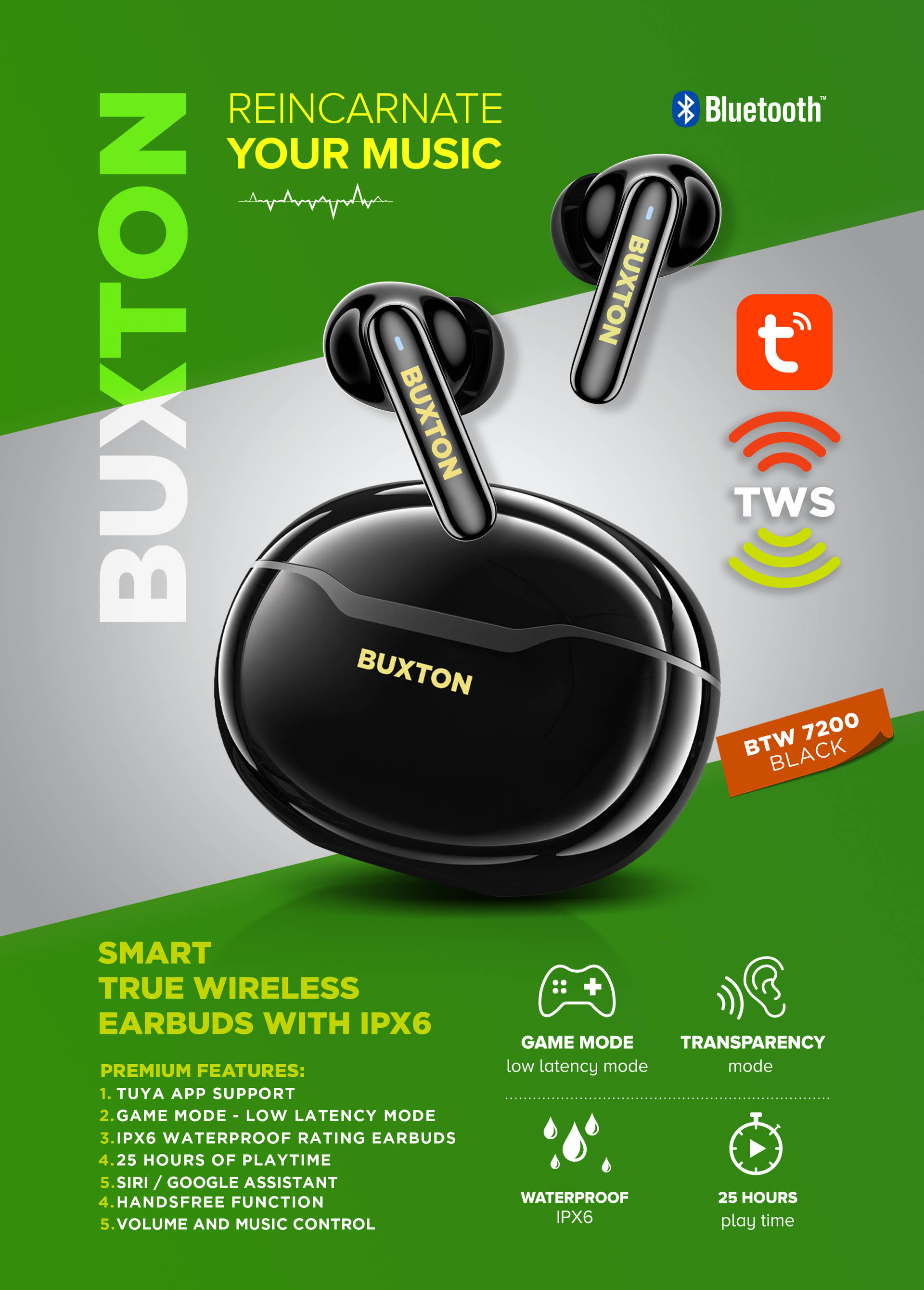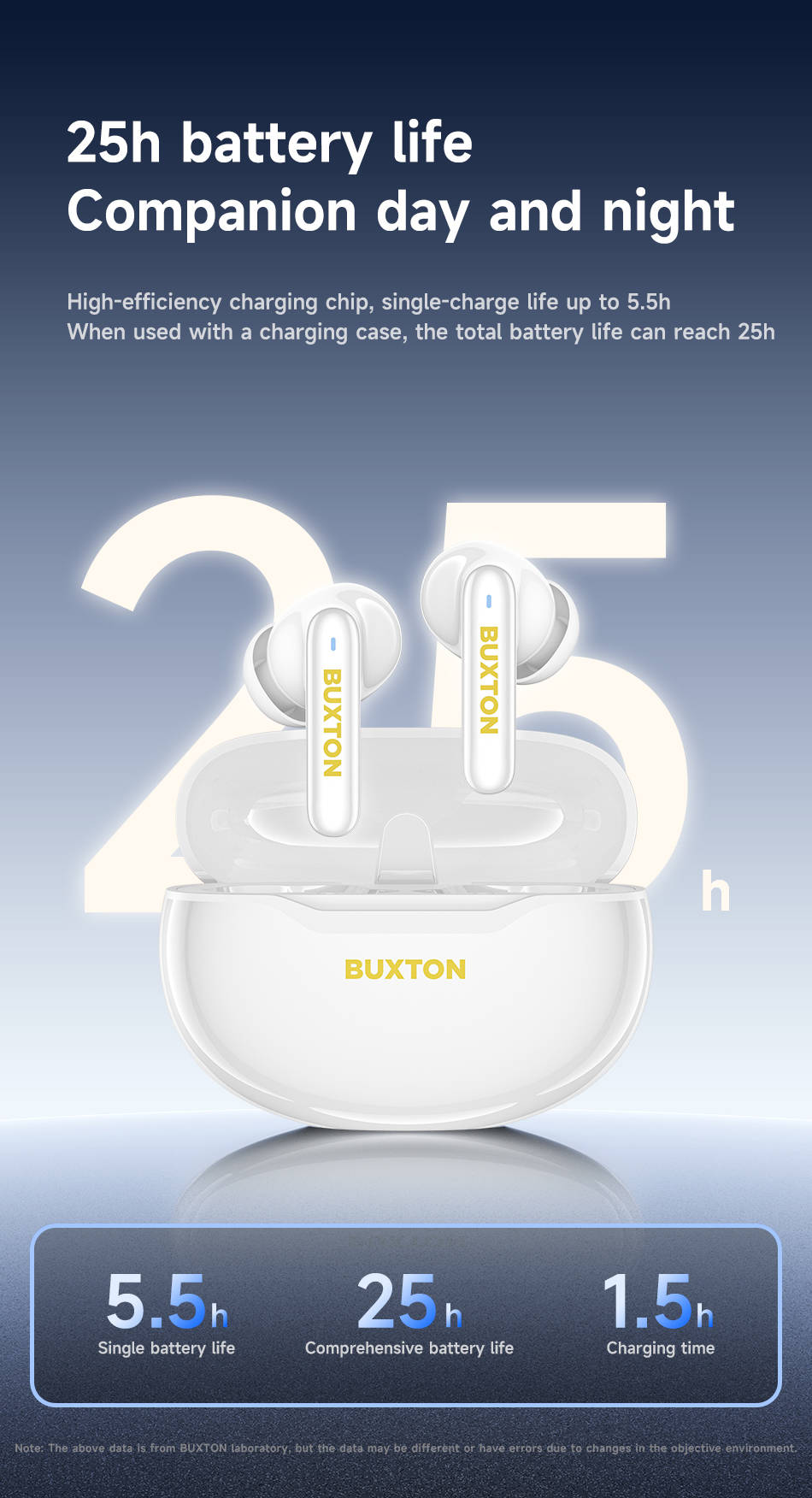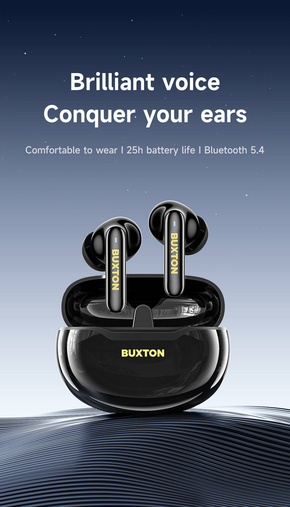 Dzięki certyfikatowi odporności na wodę i wilgoć IPX6, bezprzewodowe słuchawki BUXTON nadają się również na deszczowe dni lub do aktywnego uprawiania sportu. Całkowity czas pracy słuchawek na baterii z dołączonym etui ładującym wynosi do 25 godzin. Czas ładowania słuchawek w etui wynosi 1 godzinę, a całego etui 1,5 godziny. Ładowanie odbywa się przez USB-C. Słuchawki umożliwiają wygodne sterowanie odsłuchem i połączeniami za pomocą dotyku – bezpośrednio na obudowie słuchawek. Ergonomiczny kształt nauszników sprawia, że słuchawki są wygodne i przyjemne w noszeniu. Słuchawki obsługują asystentów głosowych Siri i Google.