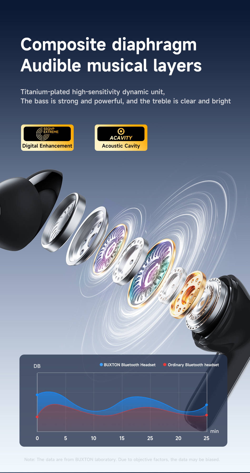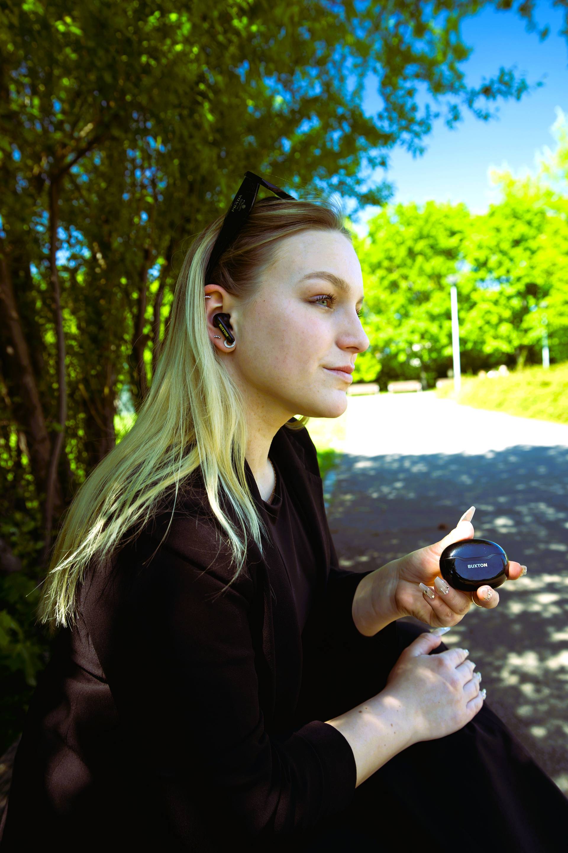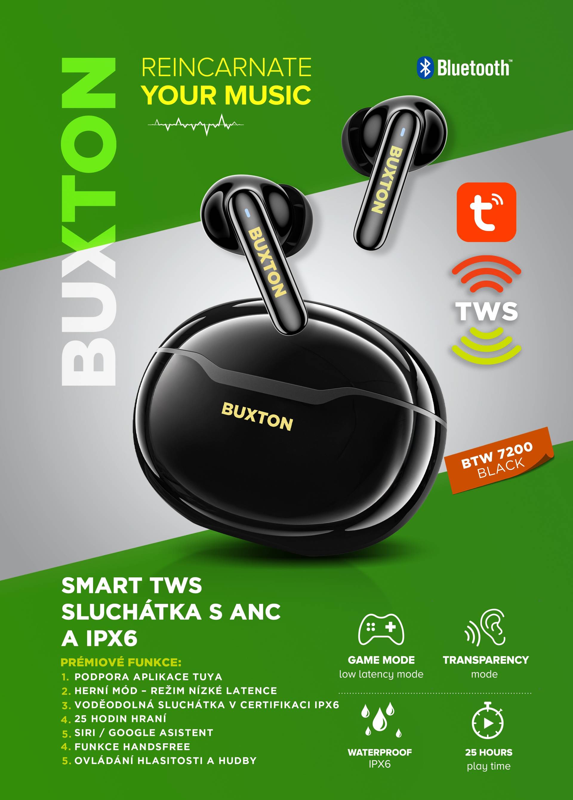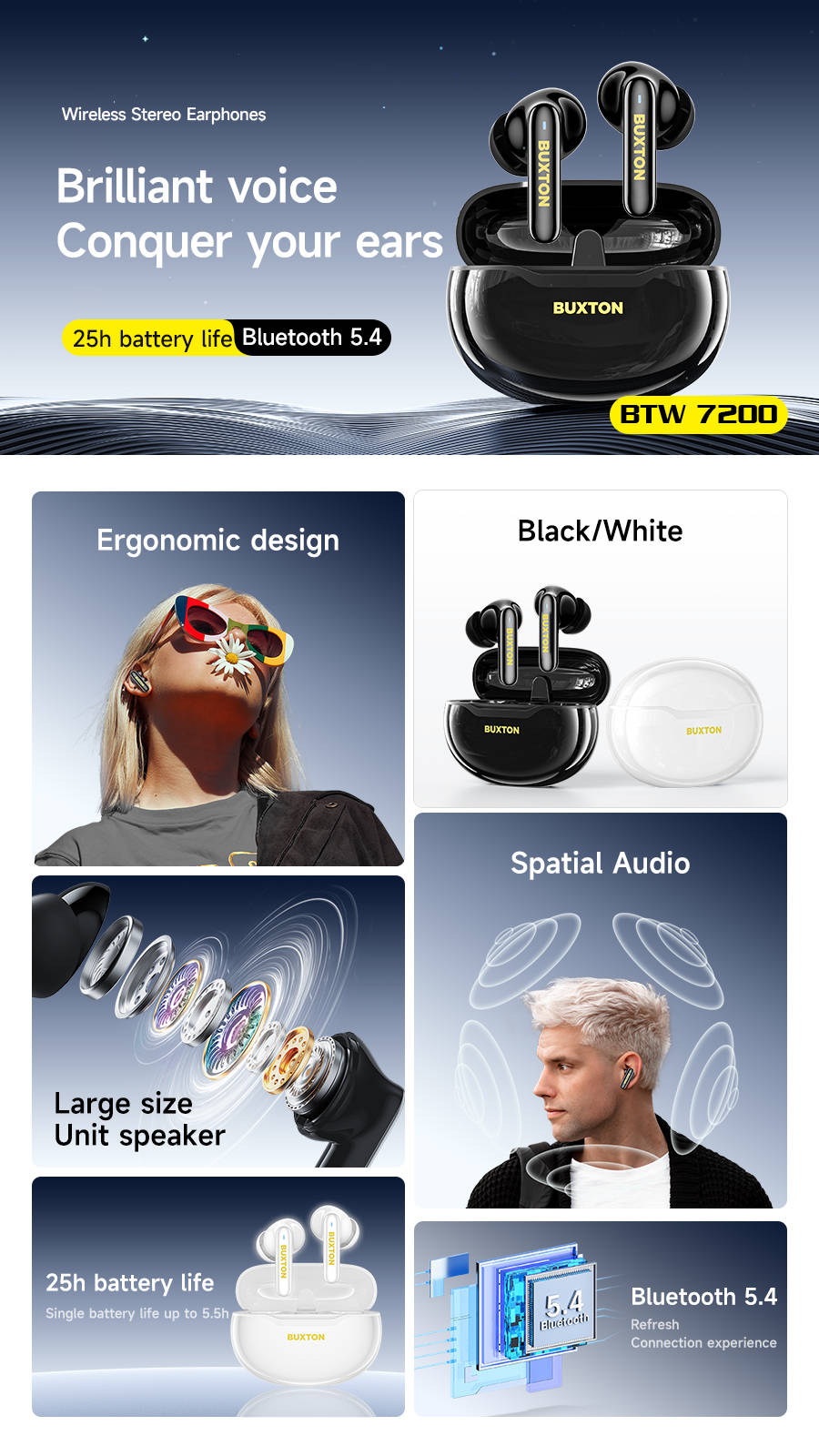Dzięki certyfikatowi odporności na wodę i wilgoć IPX6, bezprzewodowe słuchawki BUXTON nadają się również na deszczowe dni lub do aktywnego uprawiania sportu. Całkowity czas pracy słuchawek na baterii z dołączonym etui ładującym wynosi do 25 godzin. Czas ładowania słuchawek w etui wynosi 1 godzinę, a całego etui 1,5 godziny. Ładowanie odbywa się przez USB-C. Słuchawki umożliwiają wygodne sterowanie odsłuchem i połączeniami za pomocą dotyku – bezpośrednio na obudowie słuchawek. Ergonomiczny kształt nauszników sprawia, że słuchawki są wygodne i przyjemne w noszeniu. Słuchawki obsługują asystentów głosowych Siri i Google.