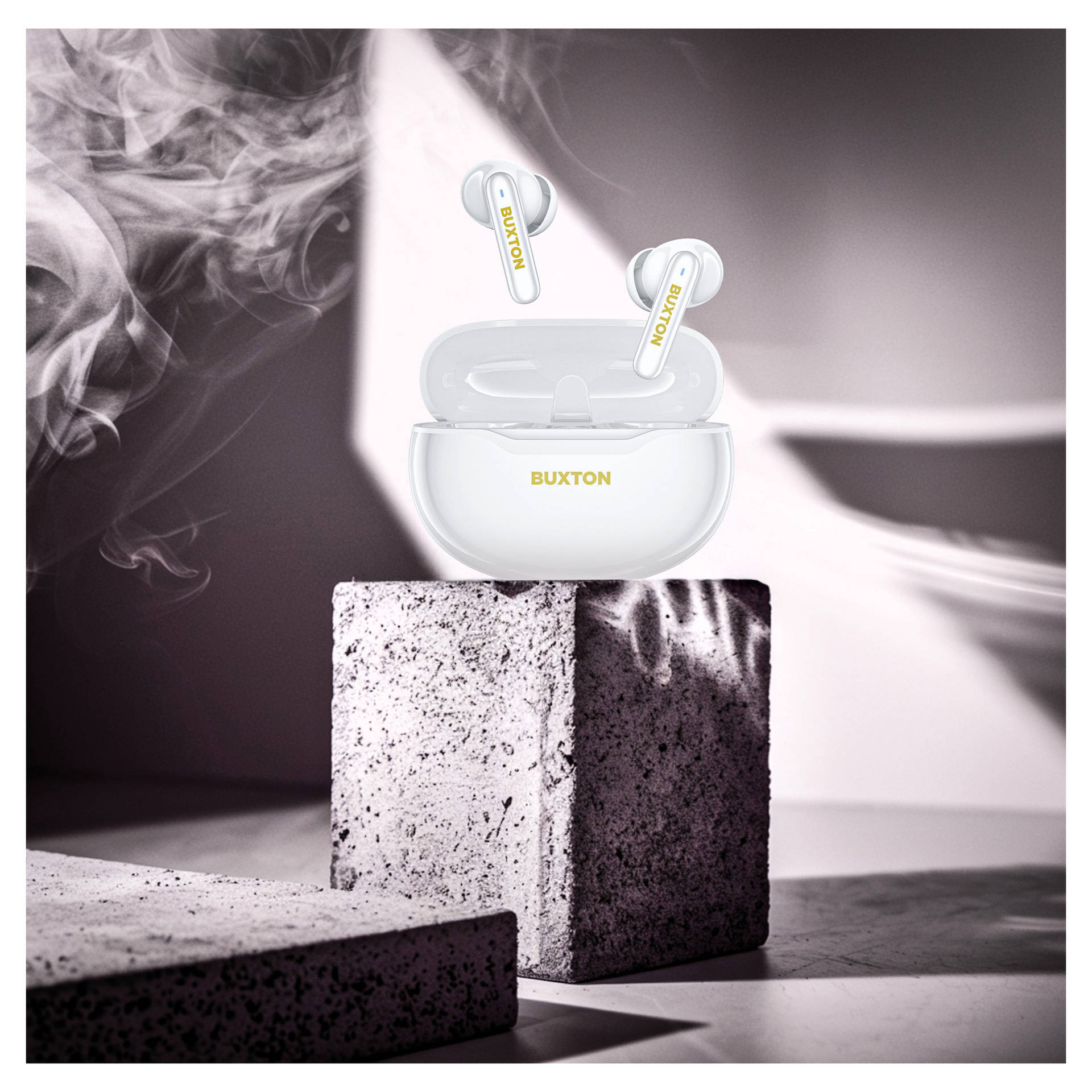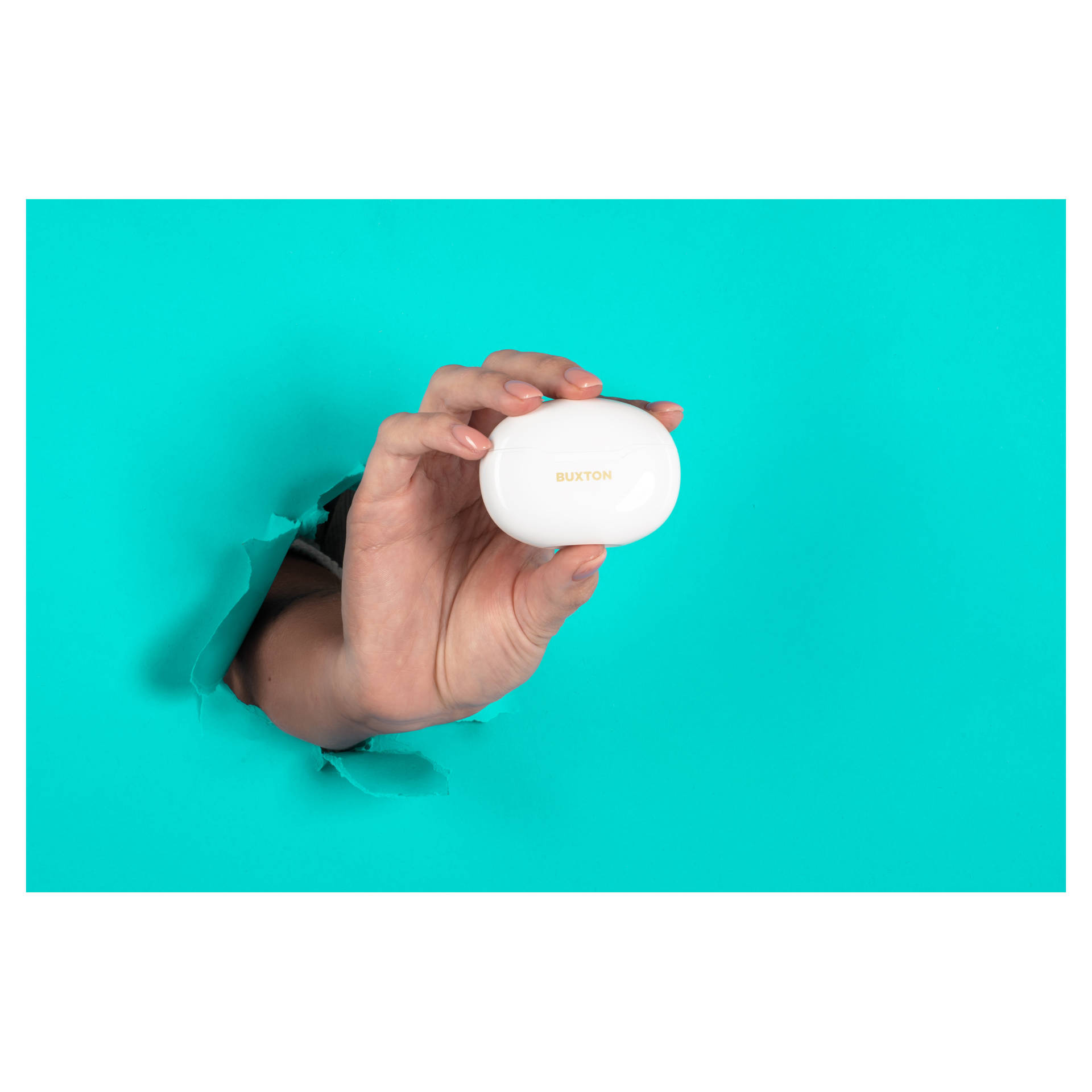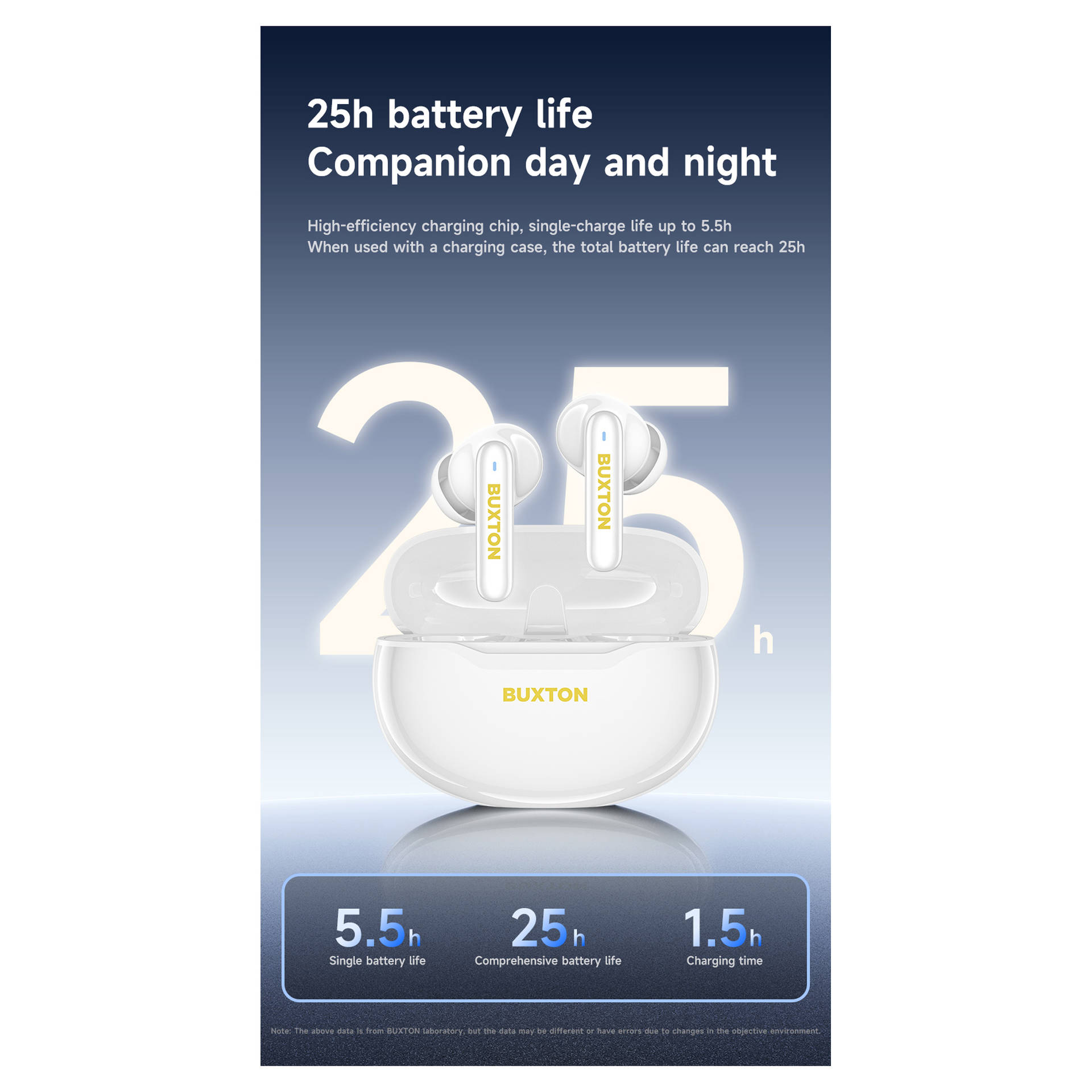 Dzięki certyfikatowi odporności na wodę i wilgoć IPX6, bezprzewodowe słuchawki BUXTON nadają się również na deszczowe dni lub do aktywnego uprawiania sportu. Całkowity czas pracy słuchawek na baterii z dołączonym etui ładującym wynosi do 25 godzin. Czas ładowania słuchawek w etui wynosi 1 godzinę, a całego etui 1,5 godziny. Ładowanie odbywa się przez USB-C. Słuchawki umożliwiają wygodne sterowanie odsłuchem i połączeniami za pomocą dotyku – bezpośrednio na obudowie słuchawek. Ergonomiczny kształt nauszników sprawia, że słuchawki są wygodne i przyjemne w noszeniu. Słuchawki obsługują asystentów głosowych Siri i Google.