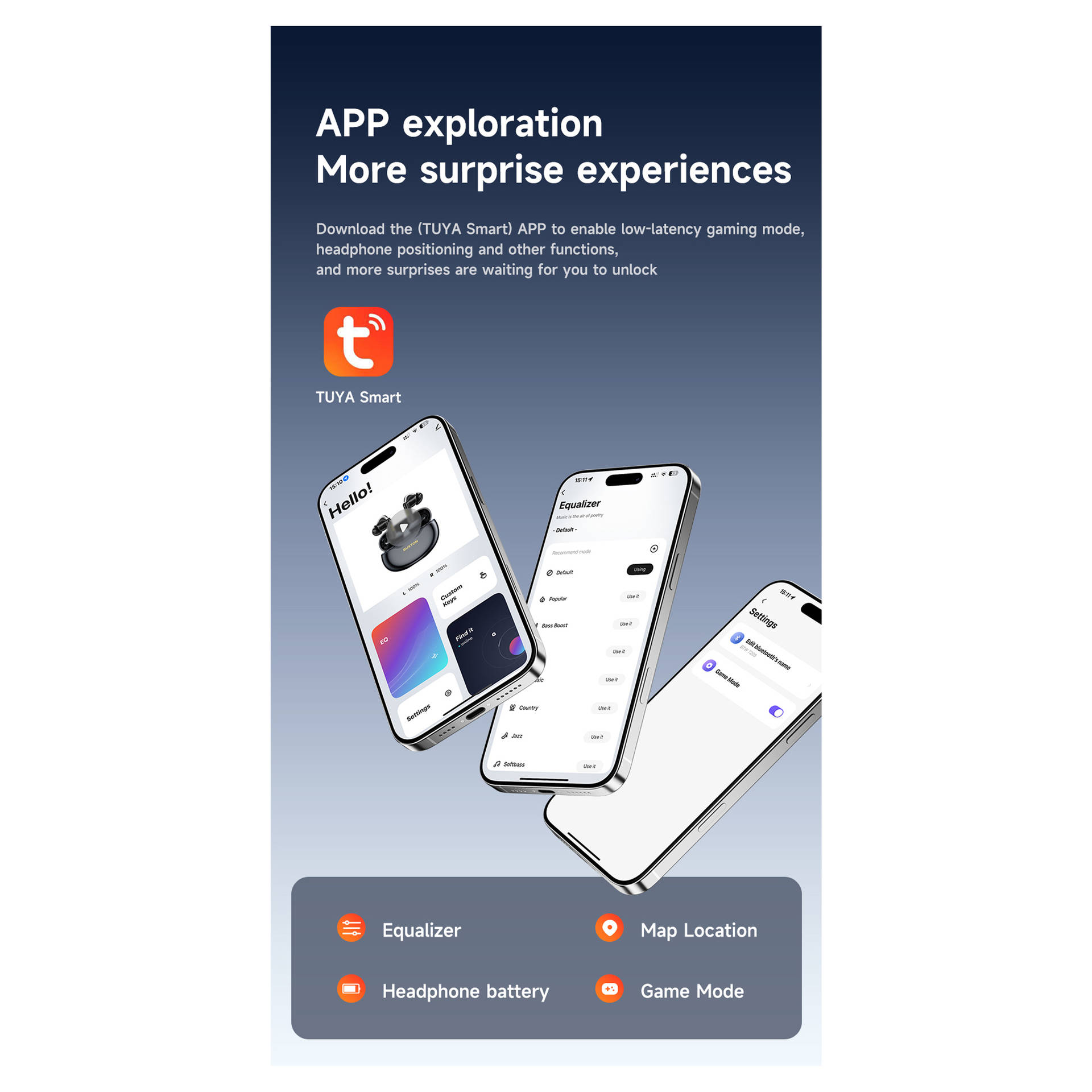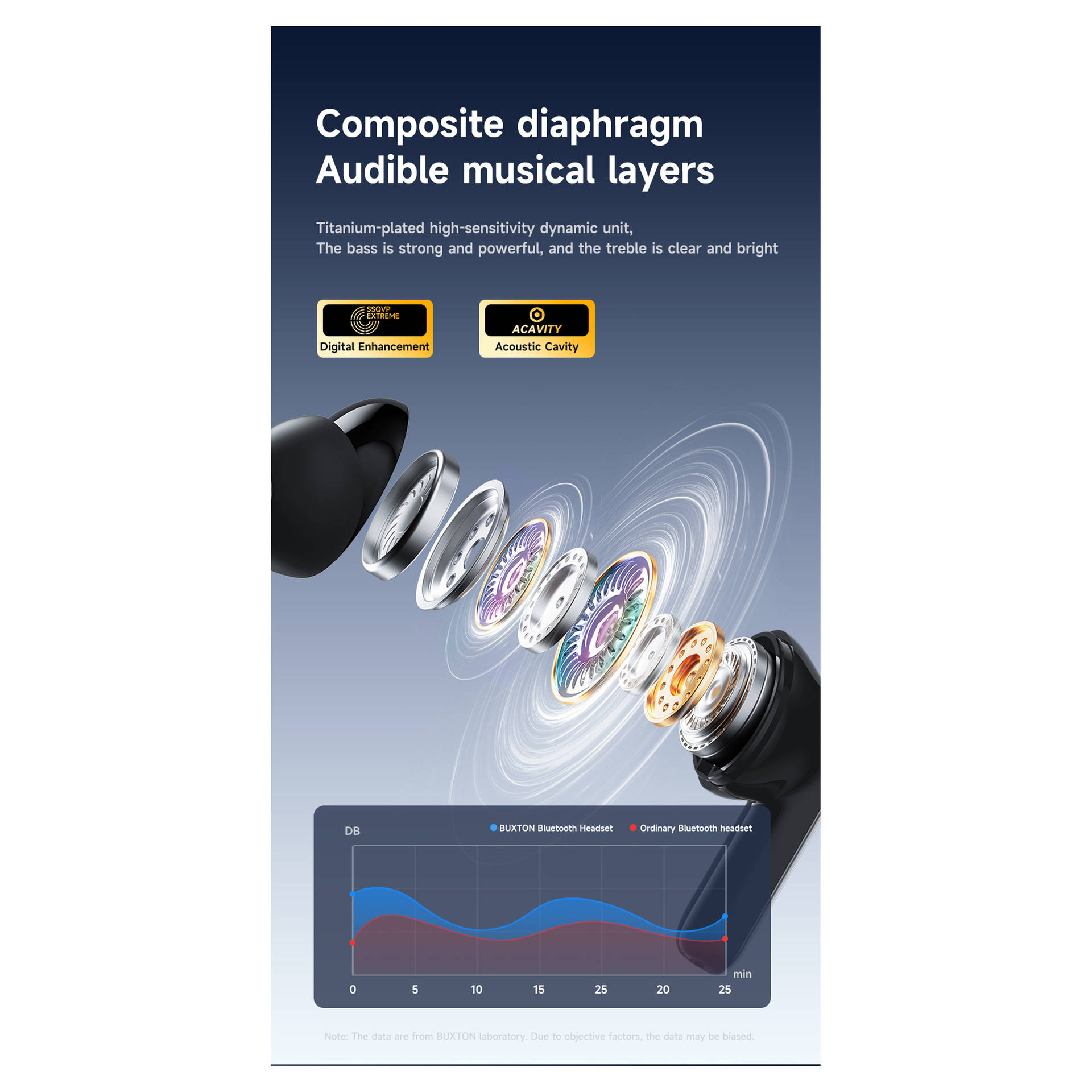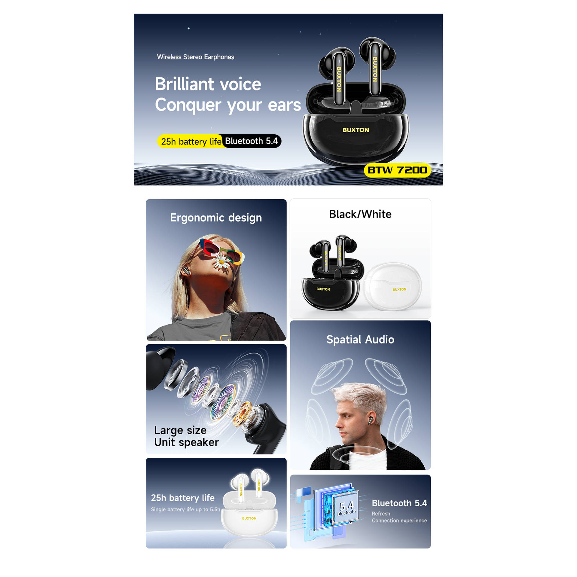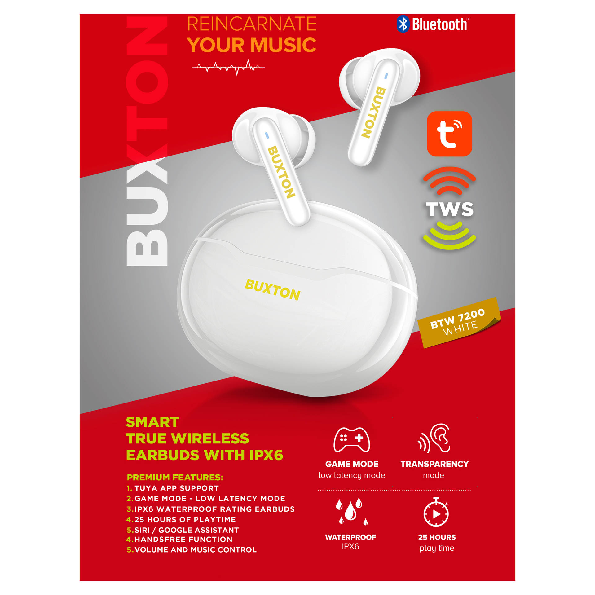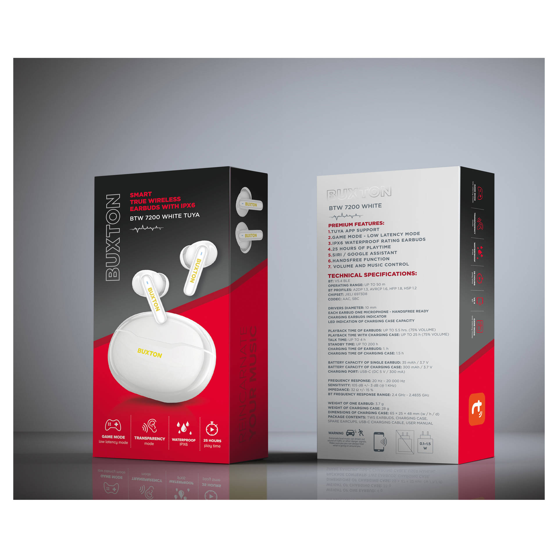 Inteligentne słuchawki bezprzewodowe BUXTON BTW 7200 TUYA łączą w sobie wysoką jakość dźwięku i intuicyjne sterowanie. Dzięki aplikacji Tuya Smart, którą można pobrać bezpłatnie, można wygodnie sterować i dostosowywać funkcje słuchawek. Możesz sprawdzić stan naładowania, wybrać profil korektora, ustawić funkcje sterowania dotykowego, sterować odtwarzaniem, a nawet wyświetlić bieżącą lokalizację słuchawek na wypadek ich zgubienia. Zestaw słuchawkowy oferuje tryb gier z niską latencją do gier mobilnych lub oglądania filmów. Słuchawki wykorzystują Bluetooth 5.4 z zasięgiem do 50 metrów od sparowanego urządzenia. Każda słuchawka jest wyposażona w mikrofon, dzięki czemu są gotowe do prowadzenia rozmów w trybie głośnomówiącym.